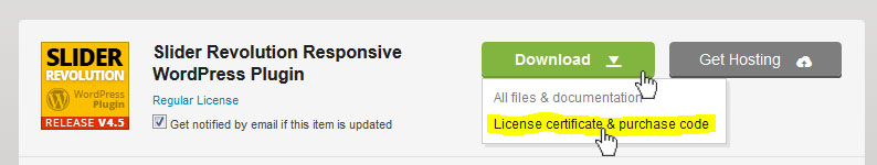 구매한 레볼루션 슬라이더 리스트옆의 Download 버튼을 누르면 나타나는 드롭메뉴 중에서, License certificate & purchase code 를 선택한다: