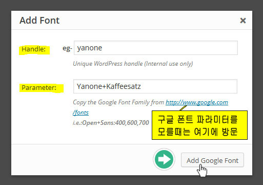 - Handle - 워드프레스 내부에서만 이 폰트를 위해 사용하는 별명을 만들어 준다.공백이 없는 소문자