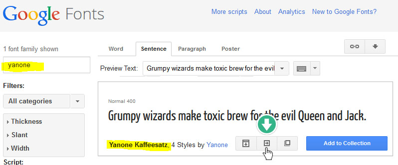 구글 폰트를 가져오기 위한 파리미터(Parameter)를 모를 경우, 구글 폰트 웹사이트에 방문하여 필요로 하는 폰트를 찾는다: