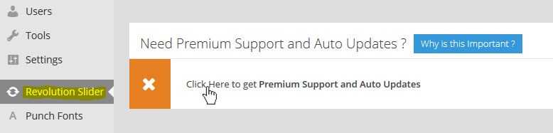 - 만약 레볼루션 슬라이더가 당신의 테마에 팩키지로 포함 되어 있었고, 그럼에도 당신이 프리미엄서비스를 받고저 따로 코드캐년에서 플러그인을 구매하였는데 구매 코드를 입력하는 섹션이 보이지 않는다면여기 와여기를 참조하라.