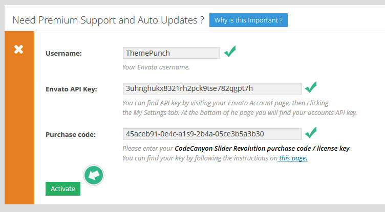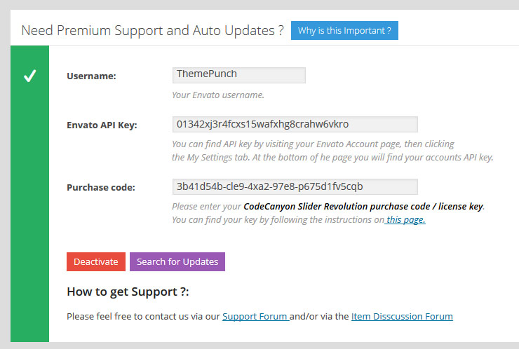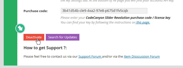 - 구매 코드 등록은 단지 코드캐년에서 직접 구매한 플러그인만 가능하다. 만약 당신이 사용하는 레볼루션 슬라이더 플러그인이 테마속에 패키지로 구매된것이라면 프리미엄 지원서비스와 자동업데이트를 받기위해선 코드캐년에서 새로운 플러그인을 구매하고 코드를 받아야한다. ( 아래의 "Need Premium Support and Auto Updates" 참조).