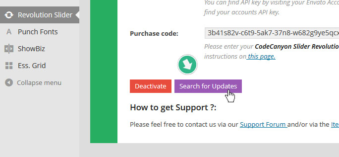 레볼루션 슬라이더 플러그인을 업데이트 하는 가장 쉬운방법은 구매 코드 등록을 한 후에, "Search for Updates" 버튼을 눌러서 업데이트 하는것이다.