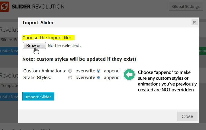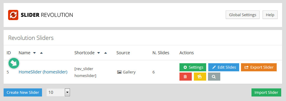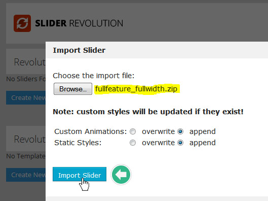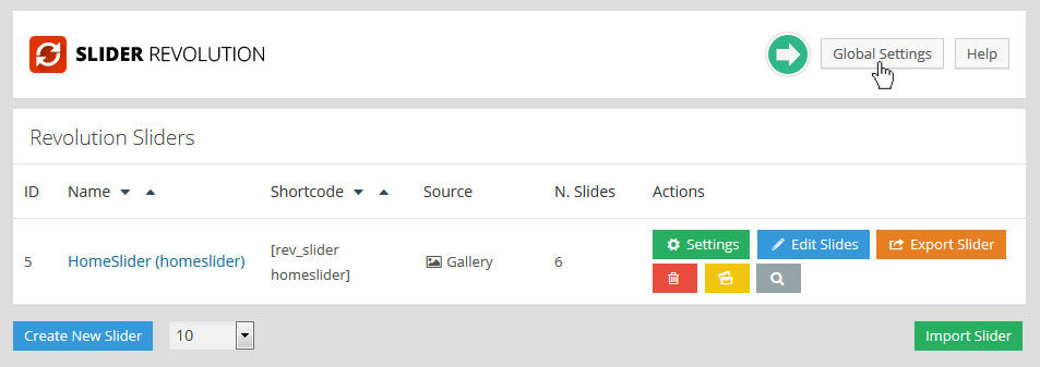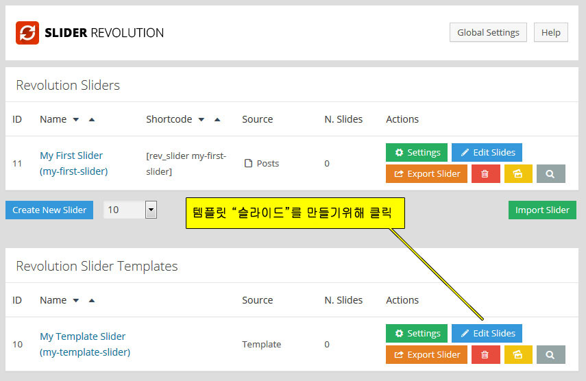 플러그인의 메인 관리 화면에가서 Import Slider 버튼 을 클릭한다: