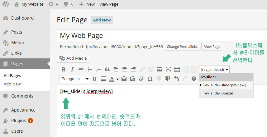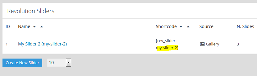 먼저 해당슬라이더의 "alias"가 특수문자나 공백이 없는지 살펴보고, 사용한 숏코드가 슬라이더 목록의 숏코드와 일치한는지 확인해 본다.예를 들어 페이지의 숏코드가 아래와 같은데...