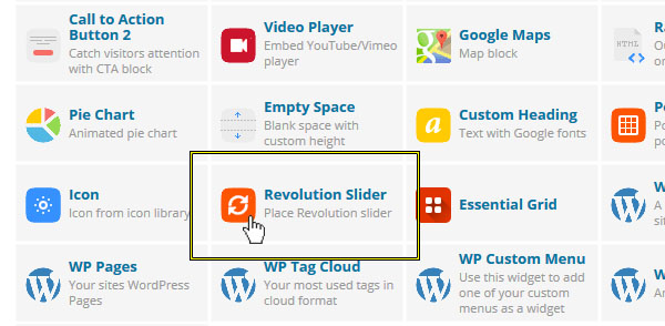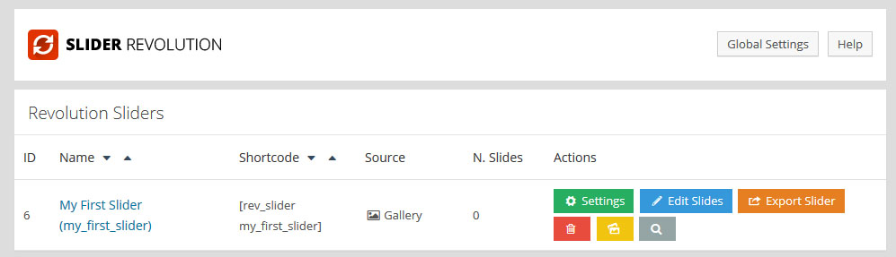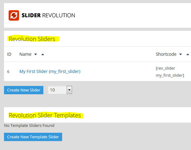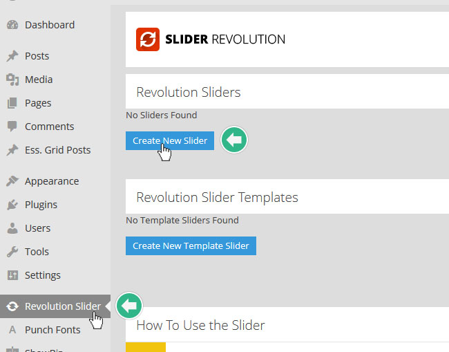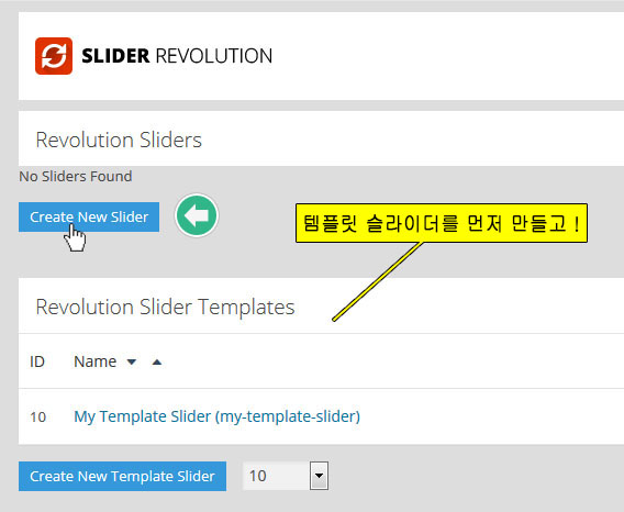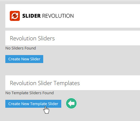 플러그인이 설치되었다면 워드프레스 메인메뉴에서 Revolution Slider를 클릭하여 들어 가면 플러그인의 메인 관리 화면이다. 중간쯤에 보면 아래의 이미지와 같은 곳이 있다: