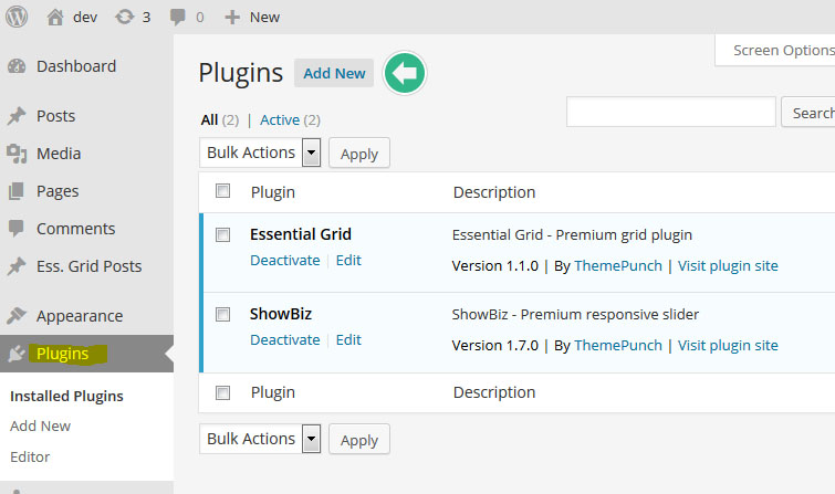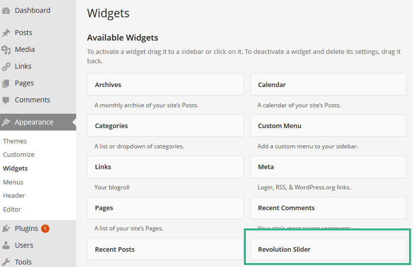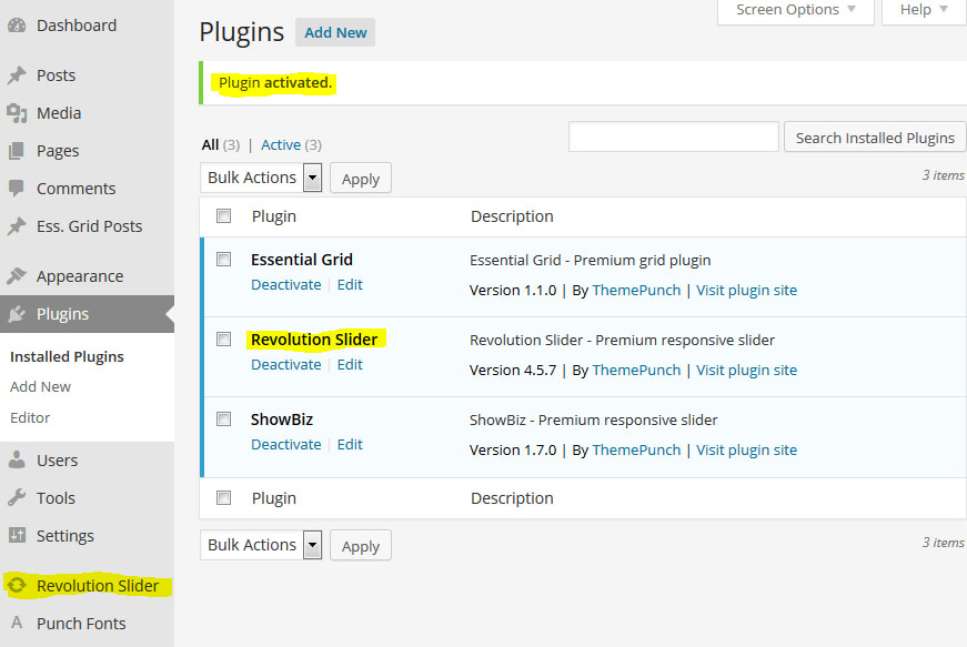 이제 Plugins페이지 리스트와 워드프레스 메인메뉴에 Revolution Slider라는 새로운 아이템이 추가 될것이다: