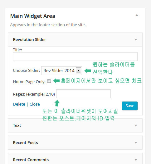 - 레볼루션 슬라이더 라이브러리를 로딩할 페이지를 지정하기: 슬라이더 라이브러리 파일이 로딩될 페이지를 개별적으로 지정할수 있다. 페이지의 ID를 콤마(,)로 구분하여 나열해서 적으면된다. 위의 2번의 옵션을 OFF 로 하고, 실제 레볼루션 슬라이더가 사용되는 페이지의 ID를 여기에 적어주면 효과적이다. 페이지나 포스트의 ID를 찾는방법.