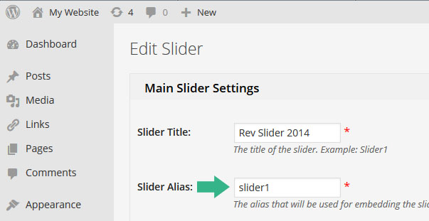 - Slider Alias: 현재 작업중인 슬라이더를 위해 제공되는 숏코드를 만드는데 사용되는 별칭. 소문자를 사용하며 공백(apace)과 특수문자가 없어야 하고, 대시(-)와 언더스코어(_) 는 사용이 가능하다.