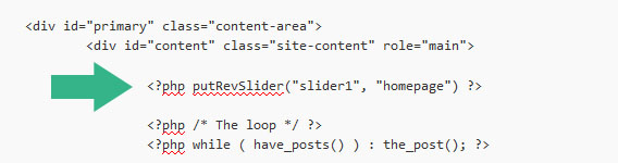 <?php putRevSlider("slider1", "homepage") ?> // 홈페이지 에서만 "slider1"을 출력한다.