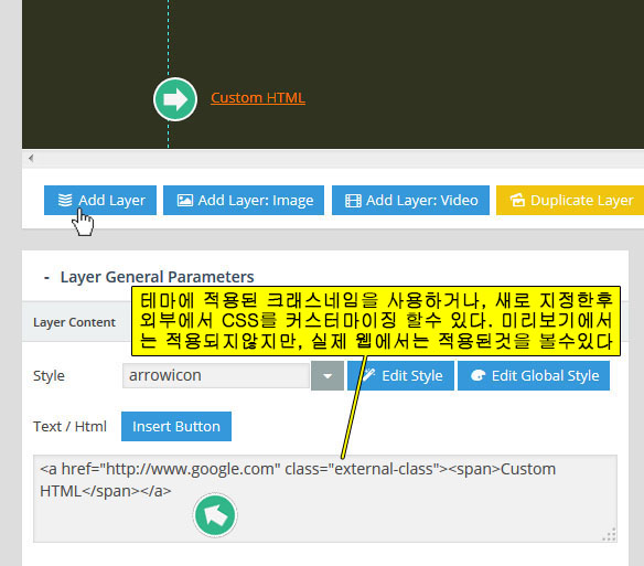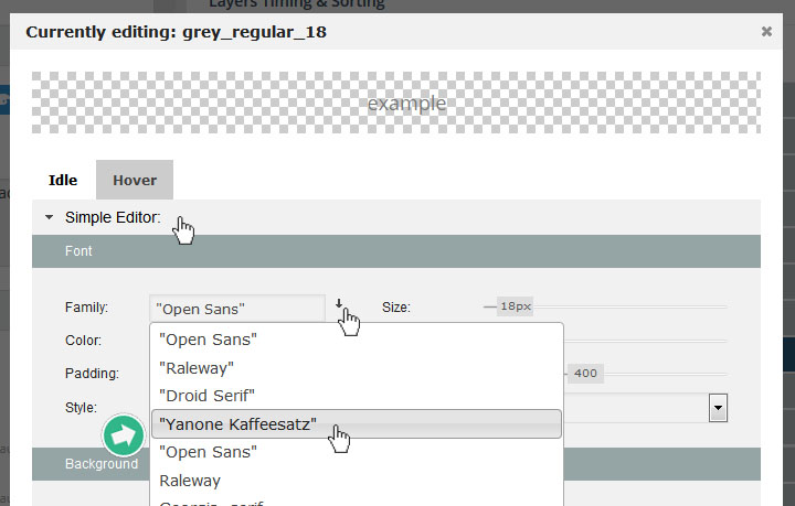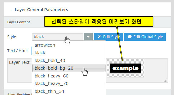 먼저 슬라이드 편집화면에서 레이어를 선택한후 Edit Style 섹션으로 들어간다. 이 때 보이는 편집창에서 Family 옵션을 드롭다운 해 보면 , 새로 추가된 구글 폰트가 목록에 보일것이다. 선택해 주면 된다: