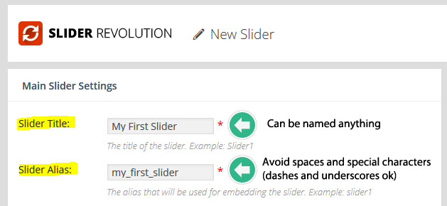 가장먼저 새로운 슬라이더에서 사용할 이름[Title : 관리자 화면에서만 사용한다.]과 별칭[Alias : 웹페이지에 삽입할 레볼루션슬라이더 숏코드에 사용된다. 소문자를 사용하며 공백(apace)과 특수문자가 없어야 하고, 대시(-)와 언더스코어(_) 는 사용이 가능하다 ] 을 만들어서 붙여준다.