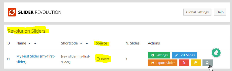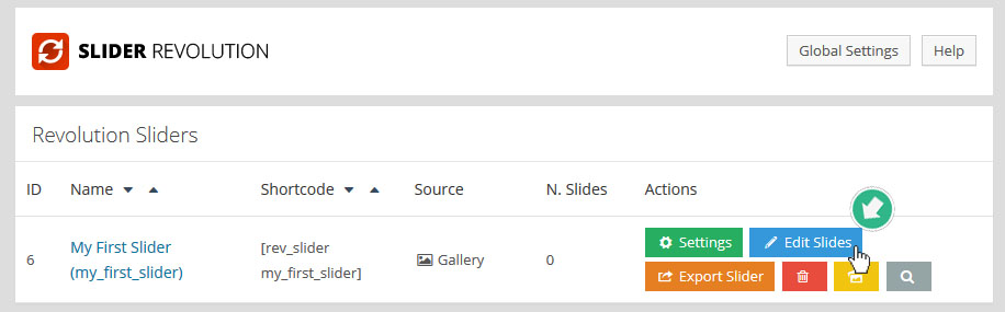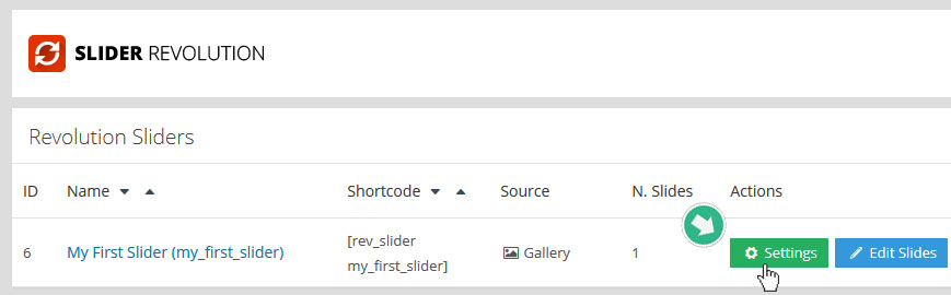 먼저 슬라이더를 새로 만들었고, 만들어진 슬라이더의 메인 세팅을 하기 위해 슬라이더 리스트 오른쪽에 있는 녹색 "Settings" 버튼을 누른다: