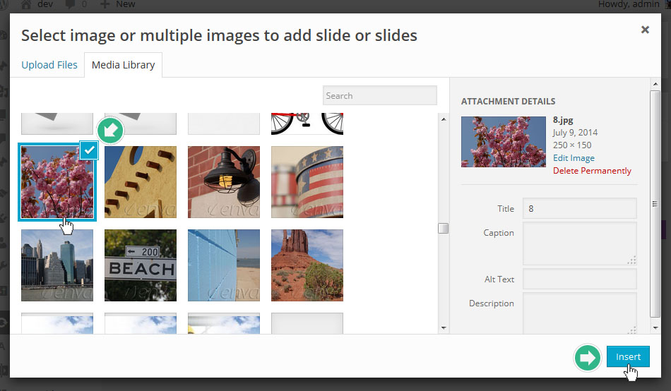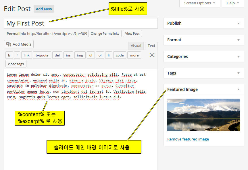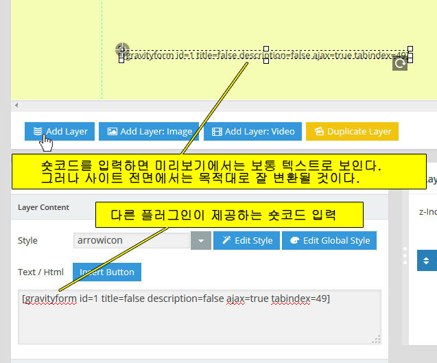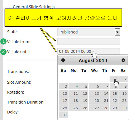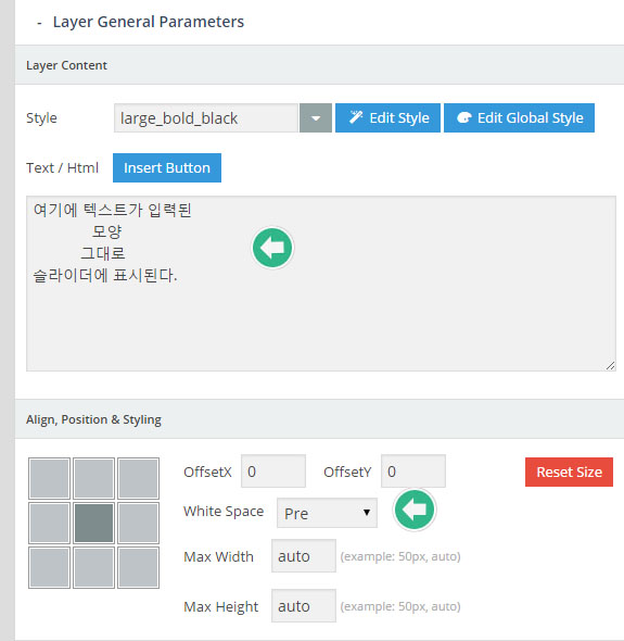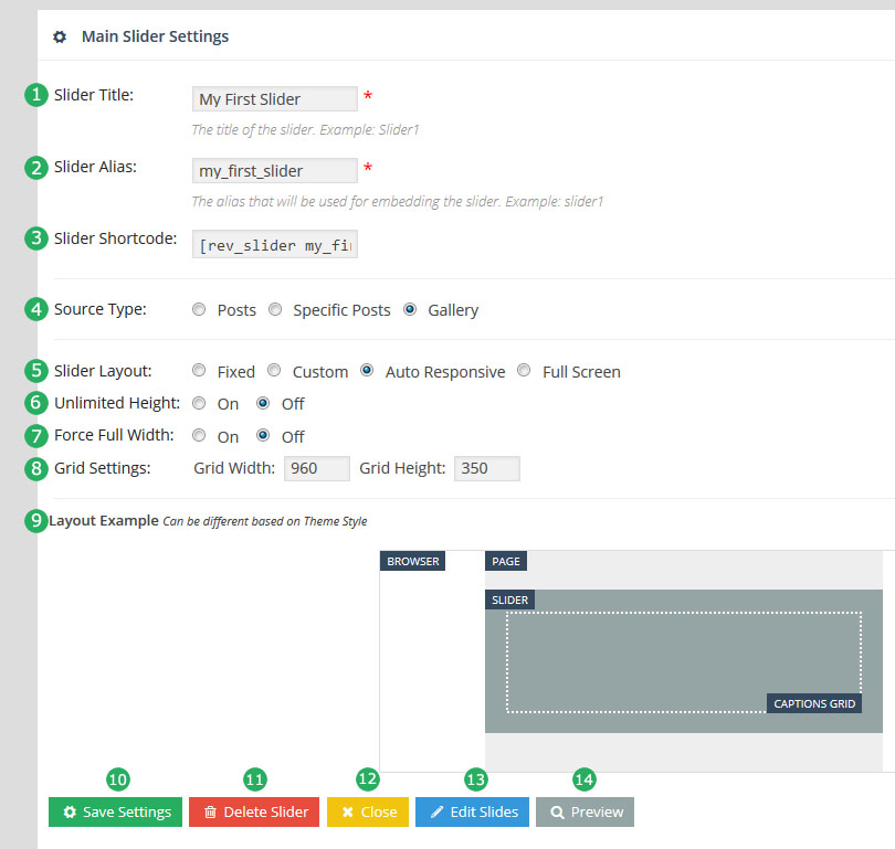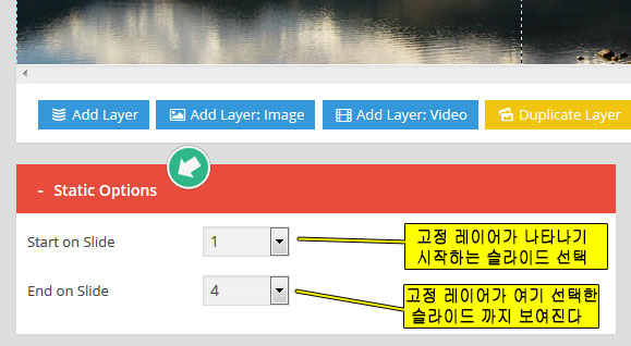 - Slider Shortcode: 바로 위의 Slider Alias에서 입력된 값으로 자동생성되는 숏코드. 이것을 복사해서 원하는 포스트나 페이지에 붙여 넣으면 현재 작업중인 슬라이더가 보여진다.