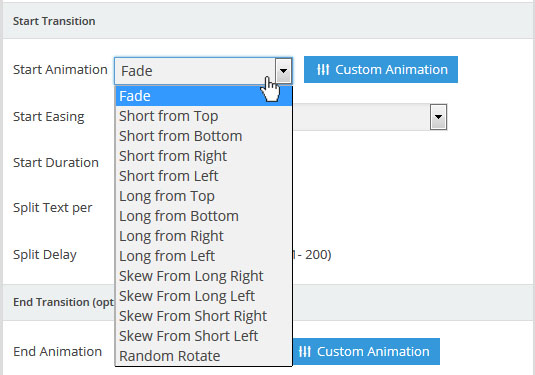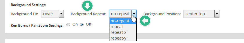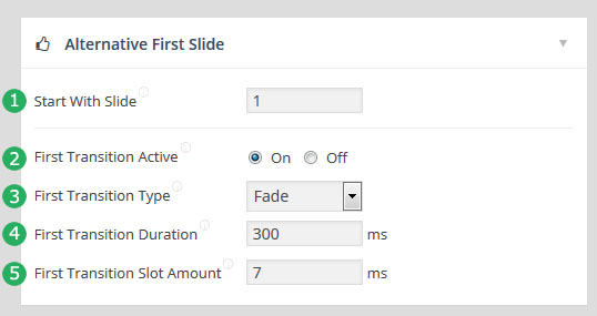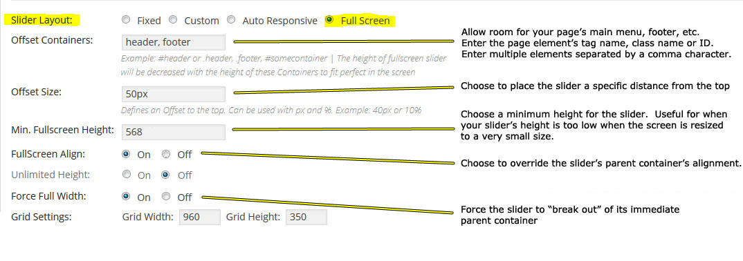 - Full Screen: 슬라이더의 사이즈가 화면의 크기와 같아 진다. 만약 화면의 크기가 1024x768 이라면 슬라이더의 크기도 1024x768 이 된다는 말이다. 그 상태에서 화면의 크기를 위/아래 로 줄이면 슬라이더의 크기도 똑같이 역동적으로 변화한다. 이 옵션은 슬라이더가 위치하게되는 부모컨테이너의 영향을 받는다. 2분의1 칼럼 속에 슬라이더가 위치해 있다면 슬라이더의 넓이는 2분의1 칼럼의 넓이와 같지만 높이는 화면의 전체 높이가 된다.(부모 컨테이너가 넓이를 구속하지만 높이를 구속하지는 않으므로) 이때 아래의 Force Full Width 옵션을 On 해 주면 부모 컨테이너도 뛰어 넘어서 강제로 화면의 크기와 같아진다. (단, 현재 사용중인 테마가 박스(Boxed)레이아웃을 제공하고, 그 레이아웃을 선택해서 웹사이트를 만든경우에는 박스를 넘어서지 못할수도 있다. 테마에 따라서 다르다):