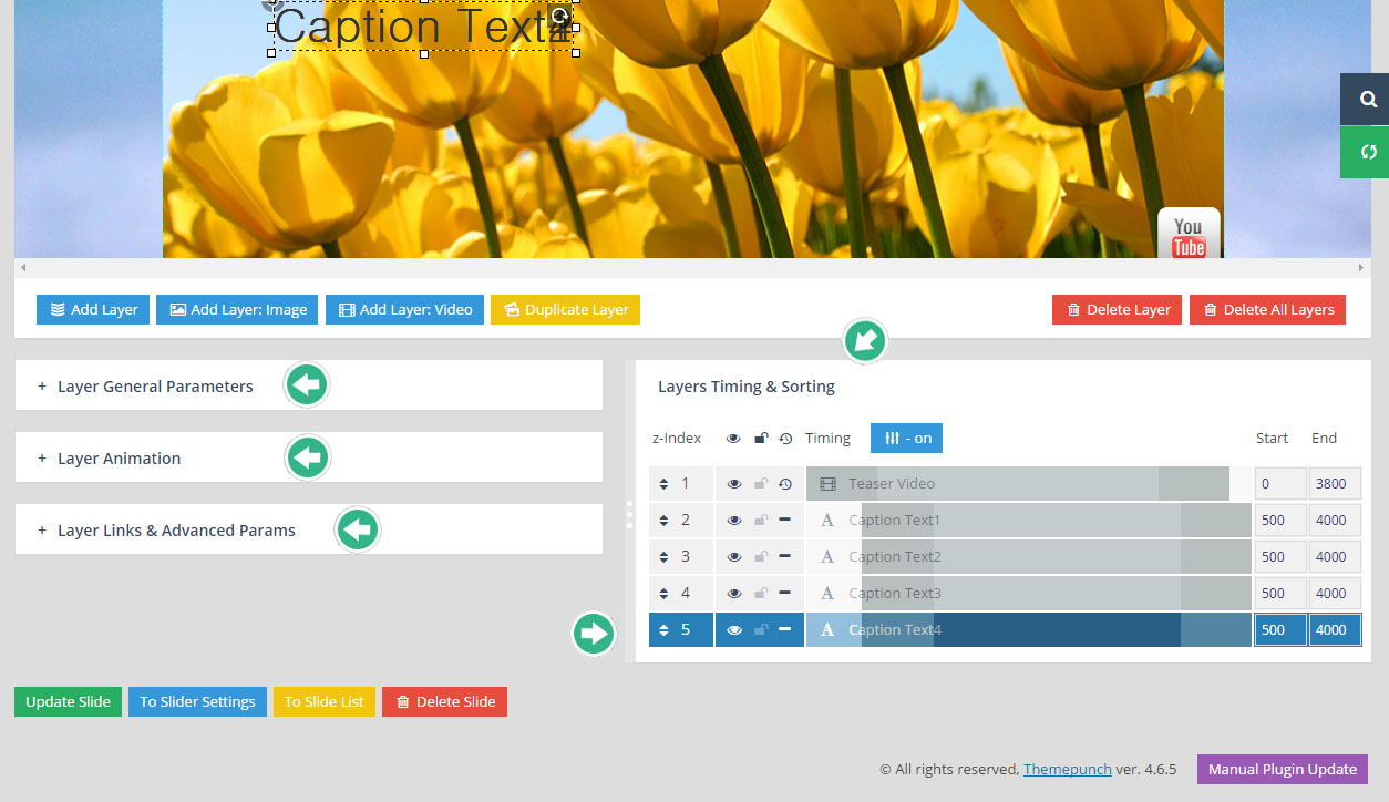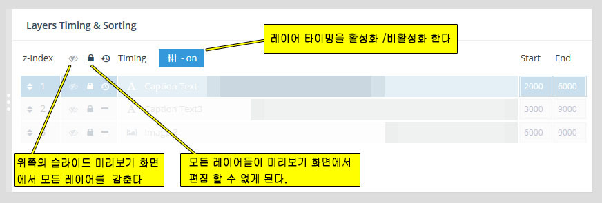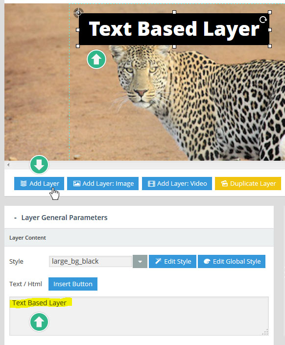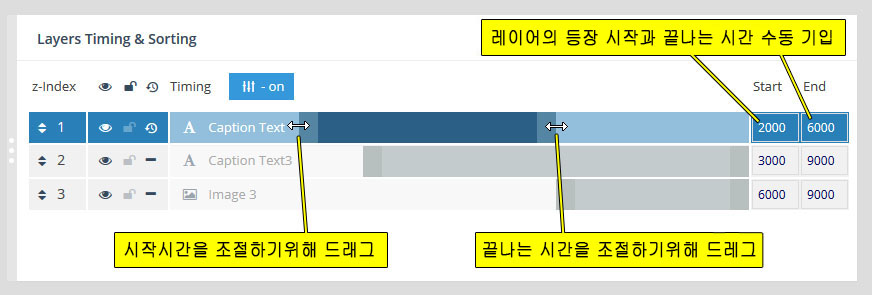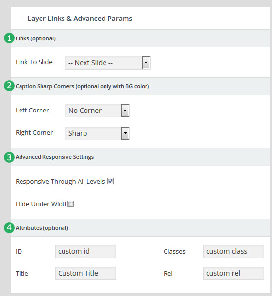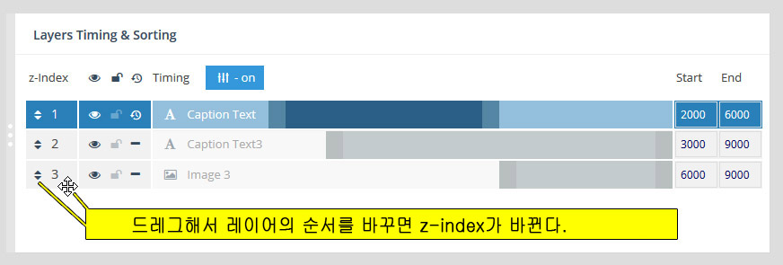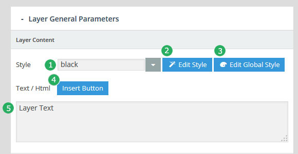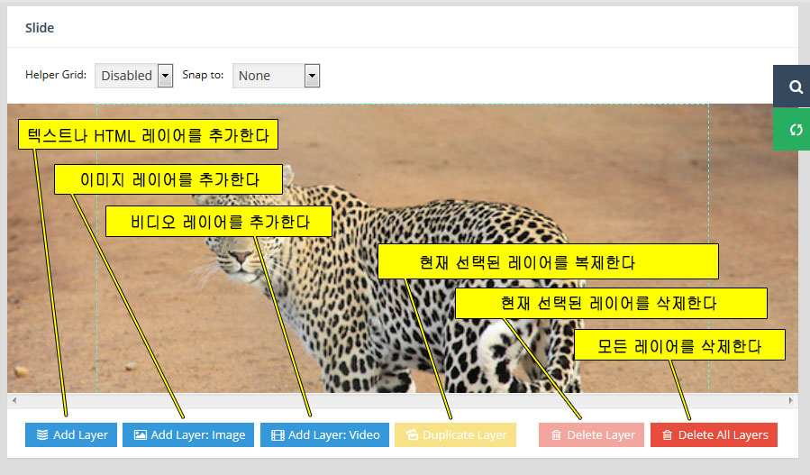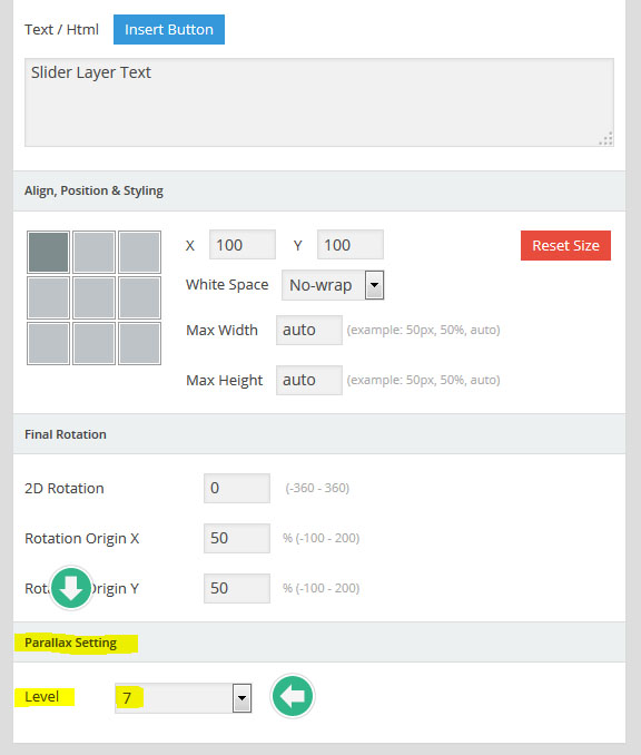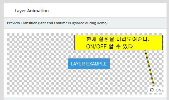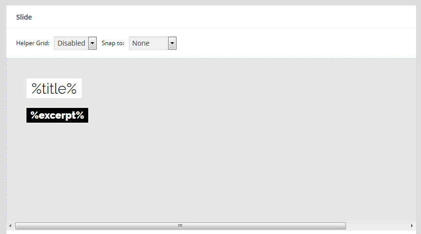- 레이어(Layer) : 만약 특정 슬라이더내의 모든 슬라이드가 10초의 단위로 순환한다면, 그 각각의 슬라이드 는 10초의 안에서 다양한 효과를 보여줄수 있다. 이때 사용하는것이 레이어 이며 레이어를 슬라이드 위에 쌓아올리면서 그 각각의 레이어 속에 하나 하나의 텍스트나 동영상, 이미지, 링크, 버튼 등을 효과와 함께 보여준다. 또한 슬라이더의 메인세팅에서 "Source Type"을 포스트타입 기반으로 선택할 경우, 이 레이어 위에 포스트의 타이틀, 글쓴이, 컨텐츠,글 작성 날짜, 우커머스 상품가격, 상품이름 등 각종 메타 정보를 삽입할수 있다