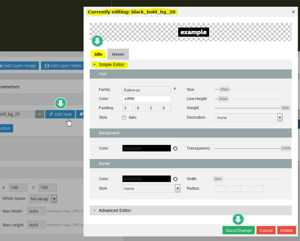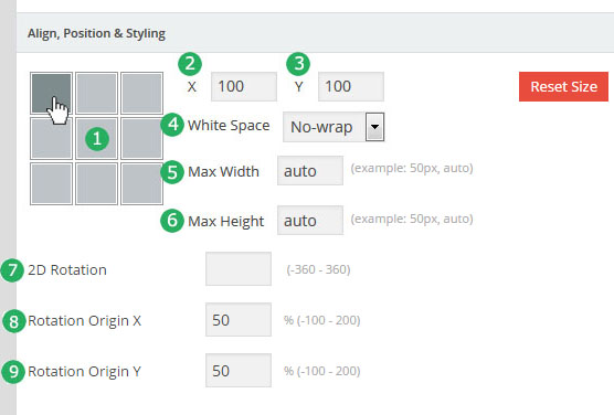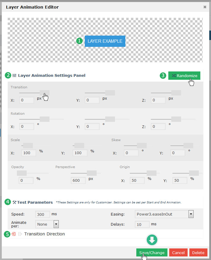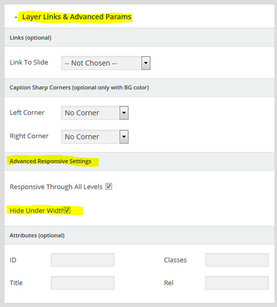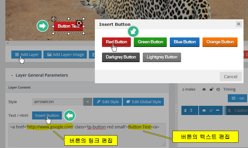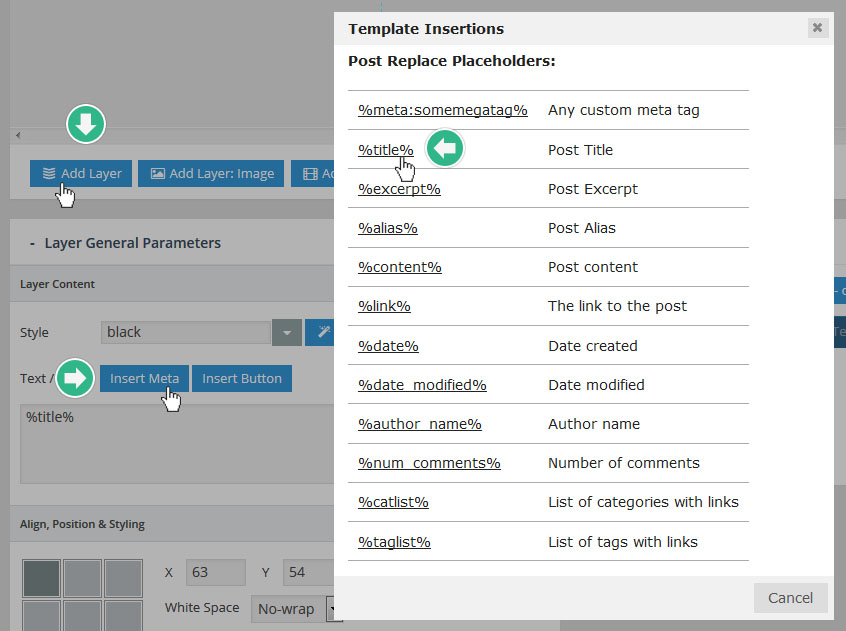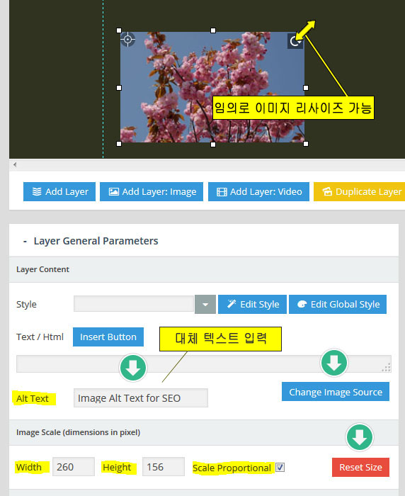 - 레이어(Layer) : 만약 특정 슬라이더내의 모든 슬라이드가 10초의 단위로 순환한다면, 그 각각의 슬라이드 는 10초의 안에서 다양한 효과를 보여줄수 있다. 이때 사용하는것이 레이어 이며 레이어를 슬라이드 위에 쌓아올리면서 그 각각의 레이어 속에 하나 하나의 텍스트나 동영상, 이미지, 링크, 버튼 등을 효과와 함께 보여준다. 또한 슬라이더의 메인세팅에서 "Source Type"을 포스트타입 기반으로 선택할 경우, 이 레이어 위에 포스트의 타이틀, 글쓴이, 컨텐츠,글 작성 날짜, 우커머스 상품가격, 상품이름 등 각종 메타 정보를 삽입할수 있다