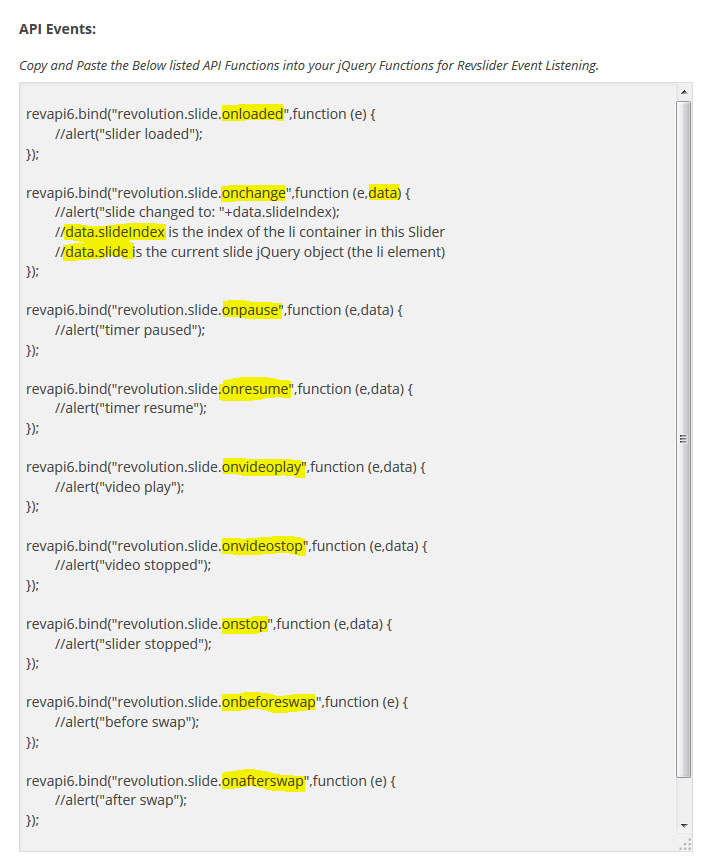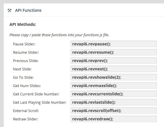 레볼루션 슬라이더는 각각의 슬라이더가 자바스크립트 안에서 하나의 객체로 존재할수 있도록 "revapi(슬라이더ID)"형식의 코드를 제공한다.이 코드가 각각의 슬라이더 객체가 되는것이고, 이 객체가 사용할수 있는 메소드와 이벤트의 목록이 아래와 같다. 이 목록의 내용들을 이용해서 사용자는 외부 자바스크립트를 만들수 있고, 또 이 외부 스크립트를 이용해서 다양한 효과를 만들수 있는 것이다.(물론 외부 스크립트는 "revapi"변수가 선언된 이후에 실행되어야만한다)