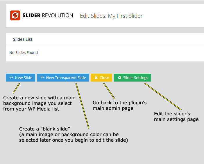 새로운 슬라이더를 만들기 위해 플러그인의 어드민 화면에 가서 Create New Slider 버튼을 누른다: