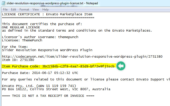 다운로드된 텍스트 파일 안에서 당신의 purchase code 를 발견할수 있을것이다. 이것을 복사하여 레볼루션 슬라이더 등록폼의 Purchase Key 칸에 붙여 넣는다: