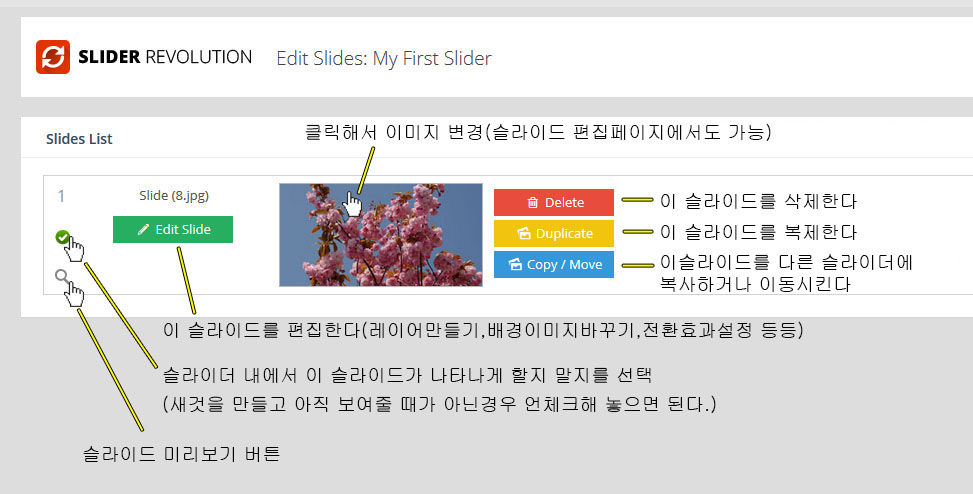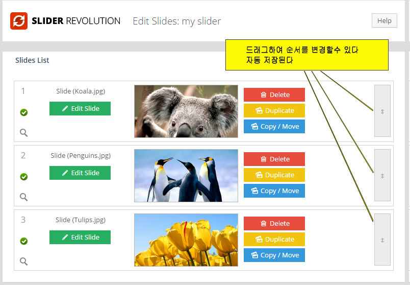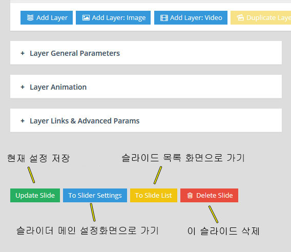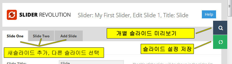 - Slider Title: 맨처음 만들어서 붙여줬던 현재 작업중인 슬라이더의 이름. 관리자 화면에서 관리용으로 사용되기만 할뿐이다.
