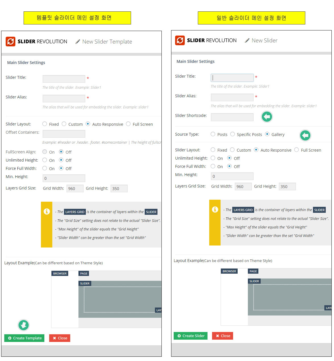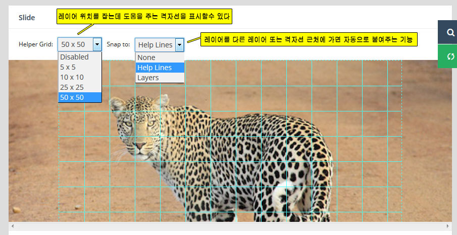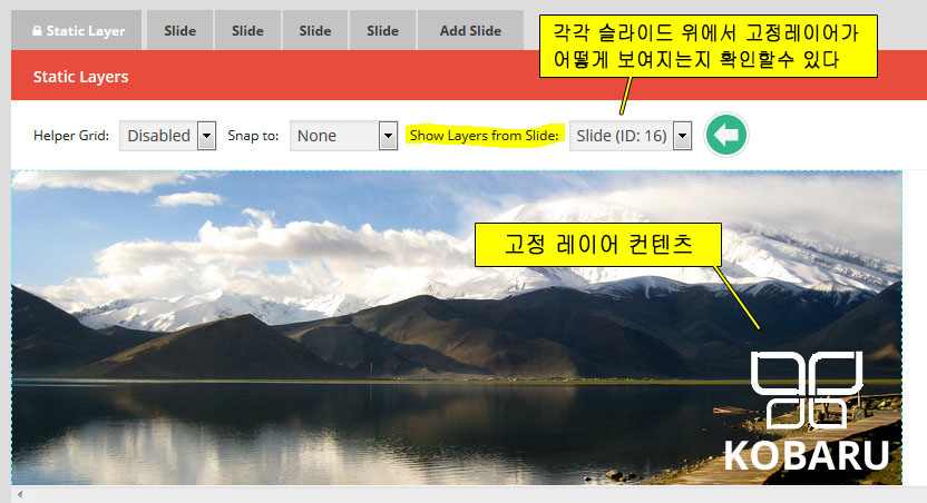 - Fixed: 반응형이 아닌 항상 같은 크기의 슬라이더, 웹사이트가 반응형이 아닐때 사용한다. Layers Grid Size에서 슬라이더의 크기를 지정한다.