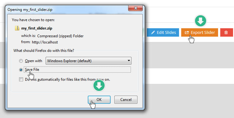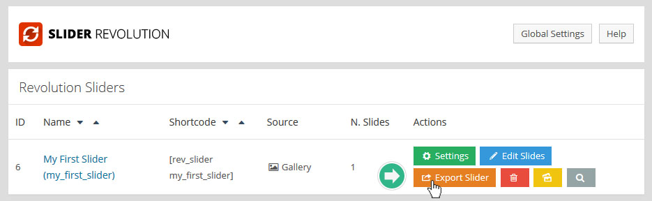 슬라이더는 내보내기와 가져오기가 가능하다. 이 기능은 슬라이더를 백업할때나 다른 워드프레스 웹사이트로 옮길때 유용하다. 내보내기를 하기 위해서 슬라이더의 목록 화면으로 간후, "내보내기( Export Slider )"버튼을 누르면, 지정된 폴더로 저장될 것이다.