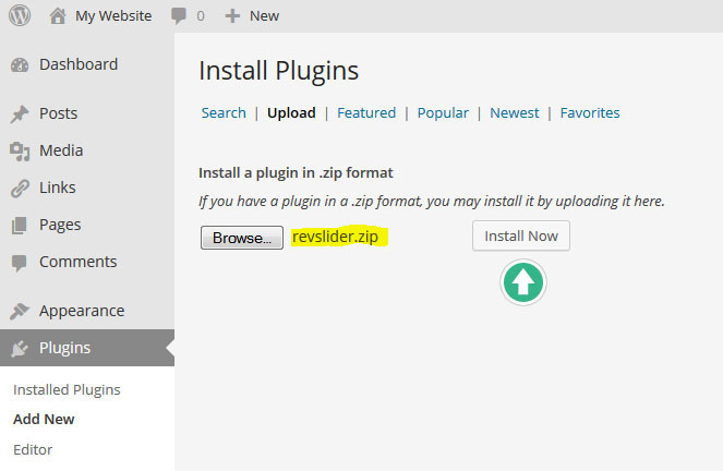 다음화면에서 Browse버튼을 누르고, 내 컴퓨터에 다운로드 받은 revslider.zip 파일을 선택한다: