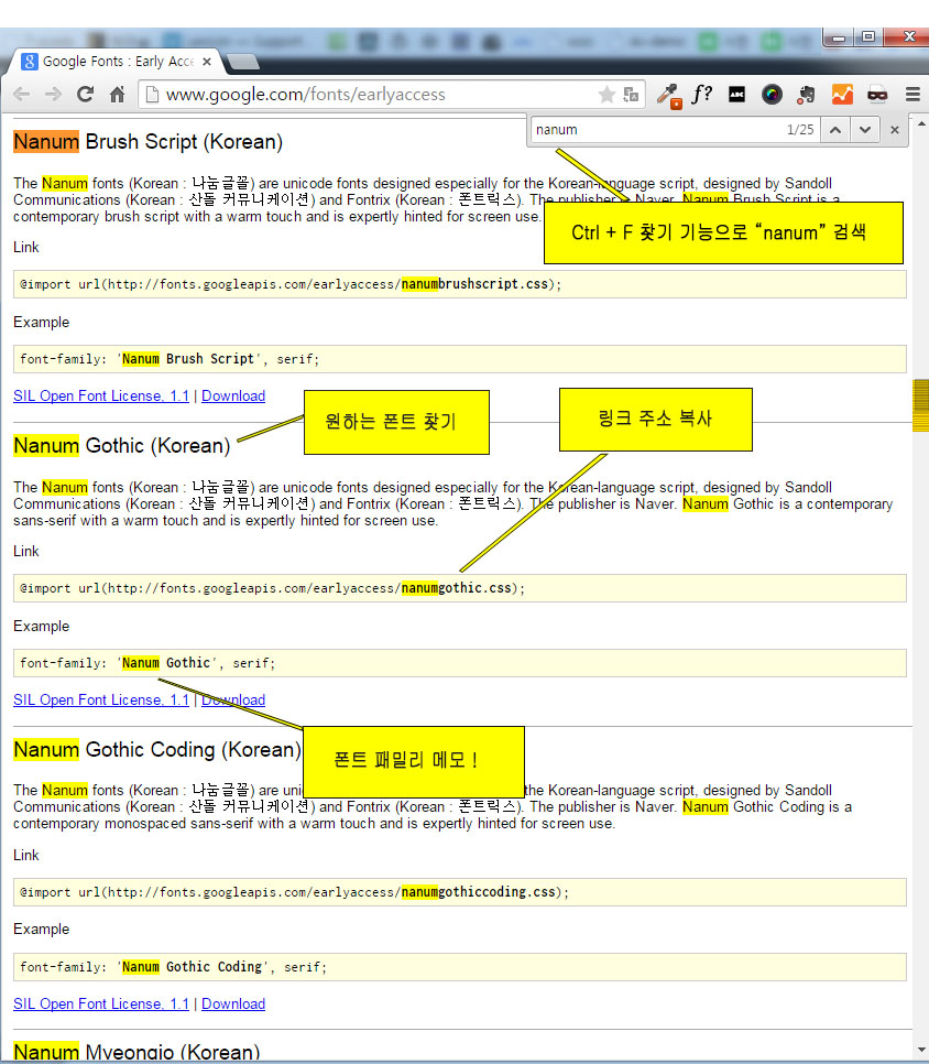 먼저 나눔폰트를 불러오는 경로를 알아야 하는데 구글 Early Access 폰트 화면으로 간다.원하는 나눔폰트를 찾아서 "Link" 주소를 복사한다.