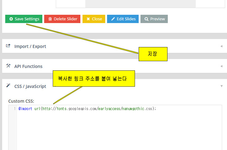 나눔폰트가 적용될 슬라이더의 메인 세팅 화면 아래부분 CSS / JavaScript 섹션에 복사한 링크를 붙여 넣은후 저장한다.