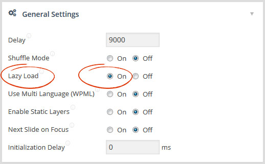웹사이트의 로딩속도를 증진시키기 위해서 "Lazy Load" 기능을 사용하는 플러그인들이 있다. (Lazy Load : 웹페이지에 많은 이미지들이 보여져야 한다면, 일단 사용자가 볼수 있는곳의 이미지 부터 보여주고, 나머지는 위치만 차지하고 있다가... 스크롤을 해서 해당영역으로 내려가면 그때 실제 이미지가 나타난다. 현재 이 레볼루션슬라이더 메뉴얼도 같은 방법을 사용한다.) 이 플러그인 들이 레볼루션 슬라이더의 img 태그의 src 속성을 변형 시켜 에러가 발생한다. 이때는 슬라이더 메인 세팅의 Genaral Settings 에서 "Lazy Load" 기능을 "Off" 하면된다.