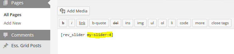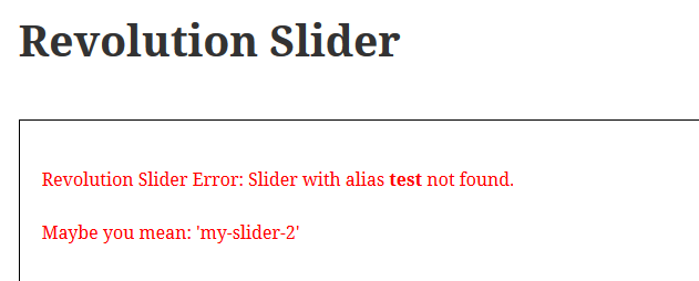 실제 슬라이더 목록의 슬라이더 "alias"는 아래와 같다면, 둘의 숏코드 이름이 같지가 않은 것이다. 이럴때는 페이지의 숏코드를 바뀌주면 해결된다(이미지의 예에서는 [rev_slider my-slider-2] 로 바꾼다)