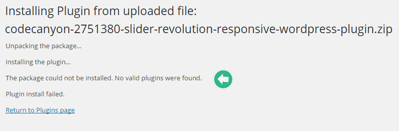 - "The package could not be installed. No valid plugins were found" 같은 메세지가 보일 경우