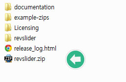 코드캐년으로 부터 레볼루션 슬라이더를 구매하고 다운로드받은 파일의 압축을 풀게되면 폴더안에 몇개의 폴더와 파일들이 보일것이다. 그중 revslider.zip파일이 설치파일이다.